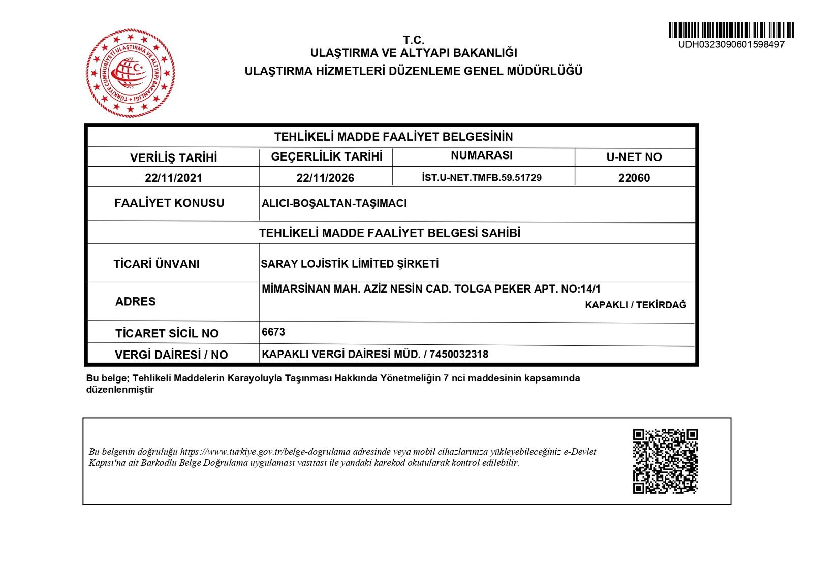 TEHLİKELİ MADDE BELGESİ